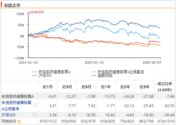 再看安信医药健康股票A,近一年收益率 -13.73%,落后业绩基准11.96个百分点,同类排名918/929。截至2024年12月31日,安信医药健康股票A期末资产净值为7.79亿元,相比2024年9月30日减少7.13亿元,下降47.81%。
