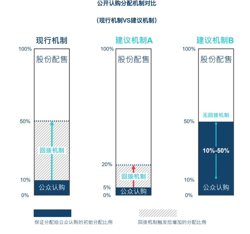 对此,咨询文件为上市公司提供了两套方案。一种是将公开认购的初始分配份额设定为5%,回拨上限为最高20%;另一种则是将公开认购的初始分配份额设定为10%~50%之间,无回拨机制。上市公司在招股时可以从上述方案中二选一。