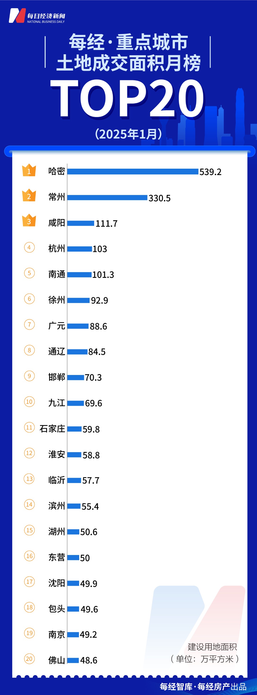 从建设用地成交面积TOP20城市来看,前三位的城市分别为哈密市(539.2万平方米)、常州(330万平方米)和咸阳(111.7万平方米),此外杭州、南通也超过百万平方米。