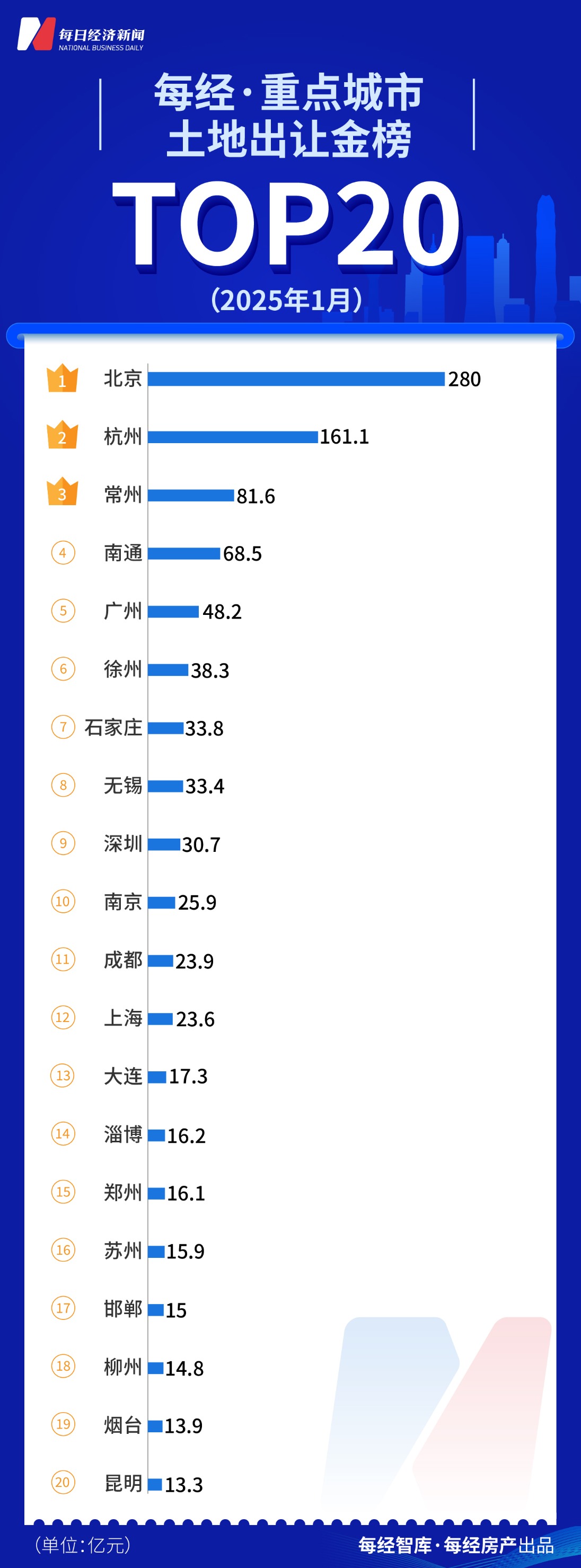 在北京、杭州等地土拍高热的带动下,2025年首月土地出让金TOP20城市合计出让金额971.5亿元,比2024年同期的878亿元,增长近百亿元。