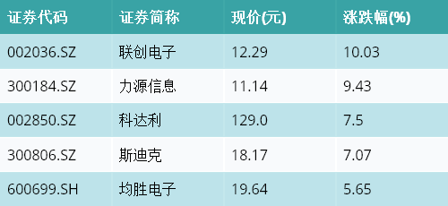 截至收盘,特斯拉概念主题涨跌幅最高的五只股票为:联创电子(002036.SZ)、力源信息(300184.SZ)、科达利(002850.SZ)、斯迪克(300806.SZ)与均胜电子(600699.SH)。详情见下表: