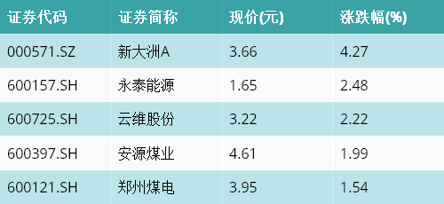 截至收盘,动力煤主题涨跌幅最高的五只股票为:新大洲A(000571.SZ)、永泰能源(600157.SH)、云维股份(600725.SH)、安源煤业(600397.SH)与郑州煤电(600121.SH)。详情见下表: