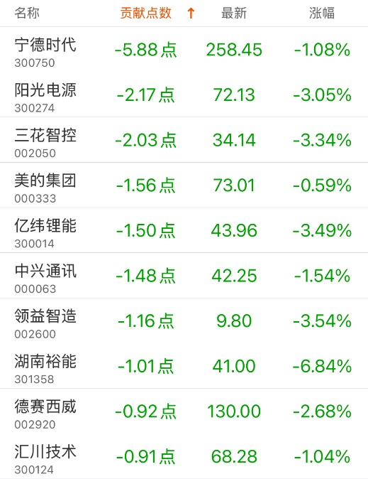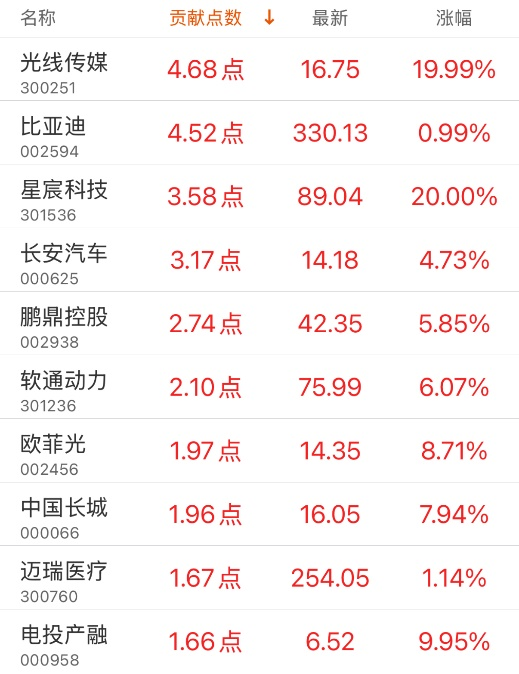 对深证成指贡献点数最多的个股是光线传媒,贡献4.68点,该股当日涨19.99%,收盘价16.75元;拖累点数最多的个股是宁德时代,拖累5.88点,该股当日跌1.08%,收盘价258.45元。