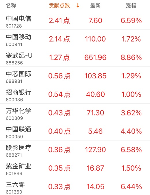 对上证指数贡献点数最多的个股是中国电信,贡献2.41点,该股当日涨6.59%,收盘价7.6元;拖累点数最多的个股是工商银行,拖累0.37点,该股当日跌0.3%,收盘价6.67元。
