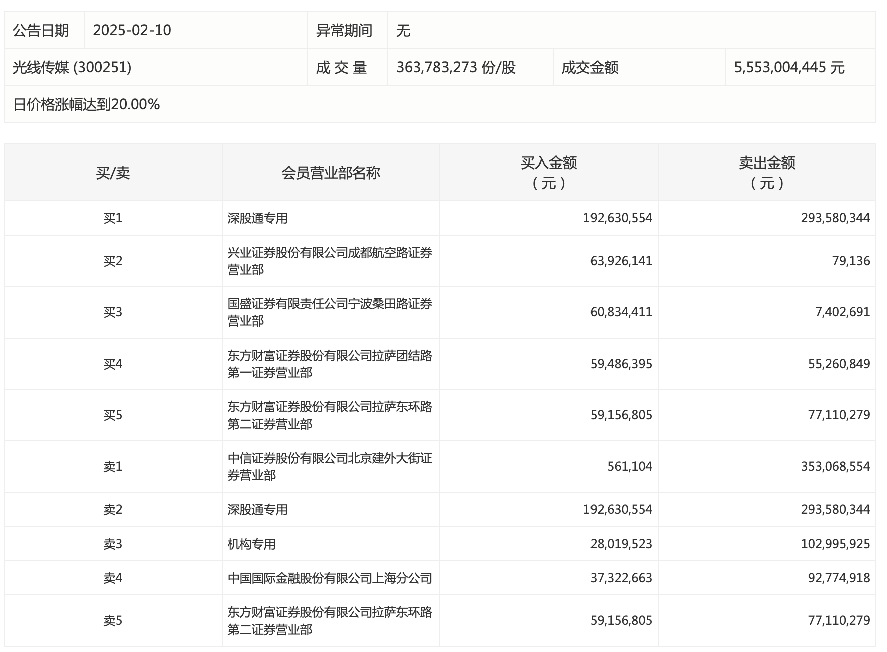 光线传媒今日涨停,盘后数据显示,一机构买入2801.95万元,卖出1.03亿元,合计净卖出7497.64万元。知名游资现身龙虎榜,国盛证券有限责任公司宁波桑田路证券营业部净买入5343.17万元。此外,深股通专用、兴业证券成都航空路证券营业部分别买入1.93亿元、6392.61万元;中信证券北京建外大街证券营业部、深股通专用分别卖出3.53亿元、2.94亿元。