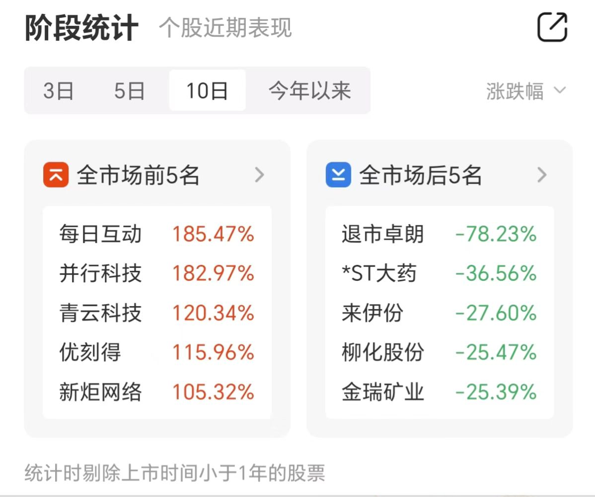 与此同时,近十个交易日涨幅前五名的个股分别为每日互动、并行科技、青云科技、优刻得、新炬网络。