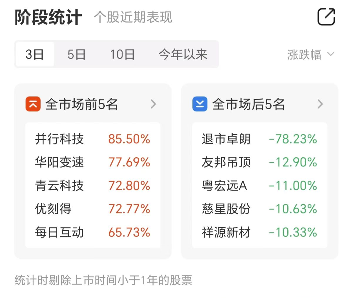2月10日市场全天震荡走高,近三个交易日里,A股全市场涨幅前五名分别为并行科技、华阳变速、青云科技、优刻得、每日互动,其中并行科技三日涨幅达85.5%,位列涨幅榜第一。