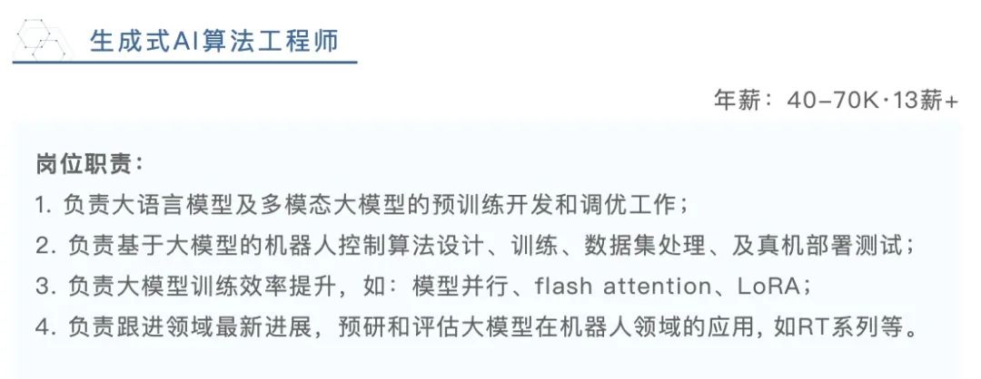 梳理岗位信息可以发现,其中人工智能领域的岗位薪酬往往更高。例如,最高薪的生成式AI算法工程师,年薪为(40K—70K)*13薪,岗位职责是负责大语言模型及多模态大模型的预训练开发和调优工作,基于大模型的机器人控制算法设计、训练、数据集处理、及真机部署测试,大模型训练效率提升等。