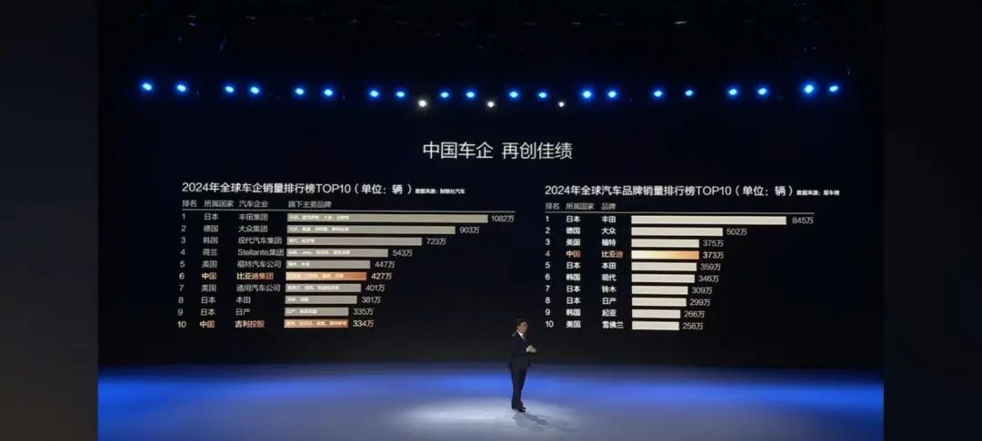 “2023年,比亚迪成为中国汽车70年来首次进入全球销量前10的中国车企,位列第九。2024年,我们再进一步,位列(全球车企)第六。从品牌的维度来看,2024年我们更是位列全球第四。”王传福表示。