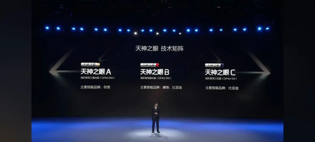 王传福表示,如今比亚迪已经形成“天神之眼”智能驾驶技术矩阵:“天神之眼A”是高阶智驾三激光版(DiPilot 600),主要搭载于仰望品牌上;“天神之眼B”是高阶智驾激光版(DiPilot 300),主要搭载于腾势、比亚迪等品牌上;“天神之眼C”为高阶智驾三目版(DiPilot 100),主要搭载于比亚迪品牌上。