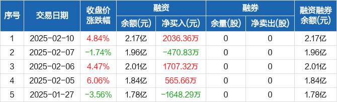 融资方面,当日融资买入6872.33万元,融资偿还4835.97万元,融资净买入2036.36万元。融券方面,融券卖出0股,融券偿还0股,融券余量0股,融券余额0元。融资融券余额合计2.17亿元。