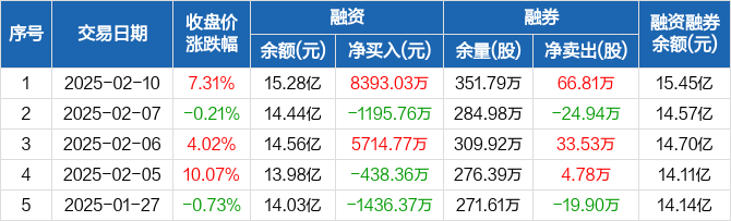 融资方面,当日融资买入3.65亿元,融资偿还2.82亿元,融资净买入8393.03万元。融券方面,融券卖出69.5万股,融券偿还2.69万股,融券余量351.79万股,融券余额1755.43万元。融资融券余额合计15.45亿元。