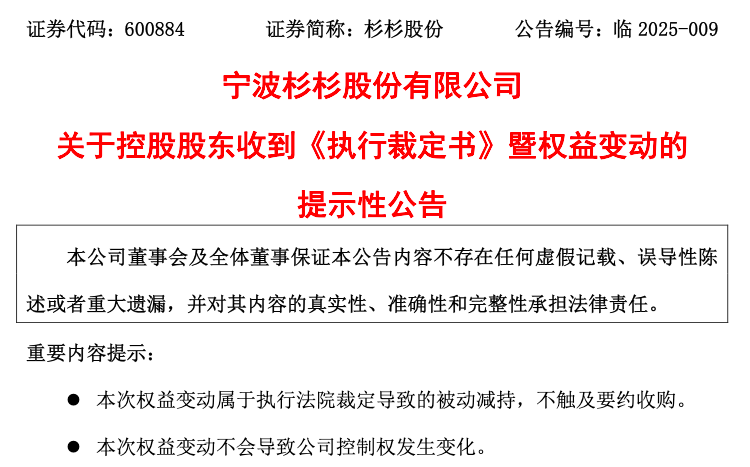 2月10日晚间,杉杉股份(600884) 发布公告称,2月7日,公司控股股东杉杉集团有限公司(下称“杉杉集团”)、杉杉控股有限公司(下称“杉杉控股”)及其一致行动人宁波朋泽贸易有限公司(下称“朋泽贸易”)、宁波市鄞州捷伦投资有限公司(下称“鄞州捷伦”)收到《山东省青岛市中级人民法院执行裁定书》。因借款合同纠纷,法院裁定将鄞州捷伦所持4829.33万股公司股份及孳息划拨至申请执行人上海海毅供应链管理有限公司名下。此次权益变动占公司总股本的2.14%,这些股票的所有权已于2025年2月6日完成过户登记。