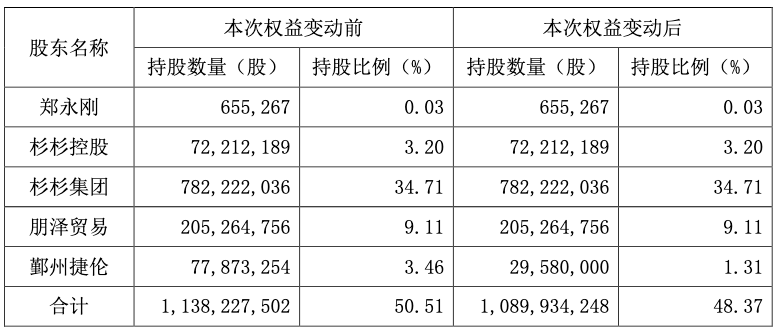 公告显示,在此次权益变动前,公司控股股东及其一致行动人共持有公司股份11.38亿股,占总股本的50.51%;变动后持股数量减少至10.9亿股,占总股本的48.37%。