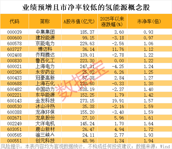 54只氢能源概念股业绩预增