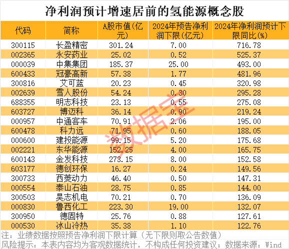 从业绩数据来看,按照预告净利润下限计算(无下限则取公告数值),2024年净利润同比增长(含扭亏为盈)的氢能源概念股有54只。长盈精密、永安药业、中集集团、冠豪高新、艾可蓝等股净利润增速靠前。
