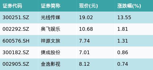 截至午间收盘,影视传媒主题涨跌幅最高的五只股票为:光线传媒(300251.SZ)、奥飞娱乐(002292.SZ)、祥源文旅(600576.SH)、捷成股份(300182.SZ)与金逸影视(002905.SZ)。详情见下表: