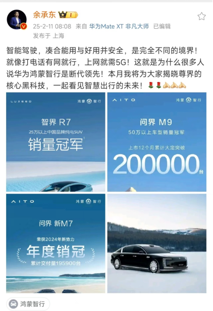 2月11日,华为常务董事、终端BG董事长、智能汽车解决方案BU董事长余承东在微博表示:“智能驾驶,凑合能用与好用并安全,是完全不同的境界!就像打电话有网就行,上网就需5G!这就是为什么很多人说华为鸿蒙智行是断代领先!本月我将为大家揭晓尊界的核心黑科技,一起看见智慧出行的未来!”