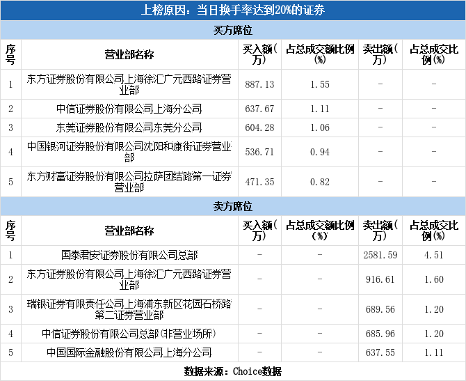 卖一席位是国泰君安证券总部,该席位卖出金额为2581.59万元,占该股总成交额的4.51%。