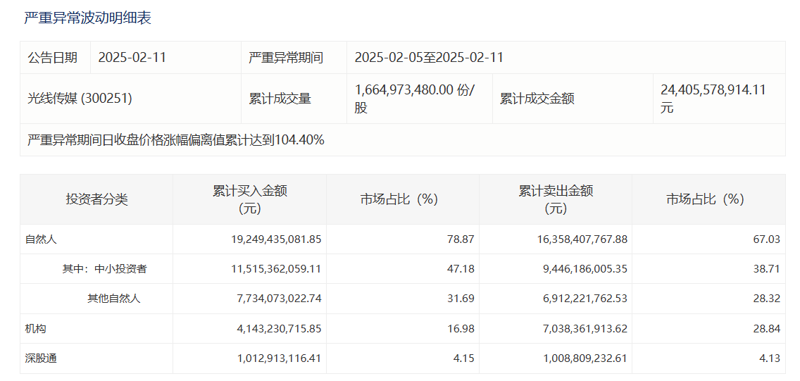 深交所网站显示,光线传媒近5个交易日累计涨幅偏离值达104.4%,期间中小投资者累计买入115.15亿元,占比47.18%;机构投资者买入41.43亿元,占比16.98%。