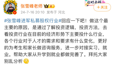 在投资圈,张雪峰也并非新人,去年7月,张雪峰已经开始做LP,当时苏州峰学蔚来教育科技有限公司成为苏州永鑫融耀创业投资合伙企业(有限合伙)LP,张雪峰曾发文回应“跨界”,称自己之所以涉足投资领域,主要是希望通过了解投资逻辑、投资方法,观察当前经济形势下的投资趋势以及各个行业对人才的需求变化。他认为,这些信息能够更好地为其咨询业务服务。