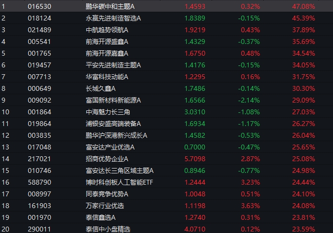 从年初至2月11日,鹏华碳中和主题A涨幅47.08%,领涨全市场基金;永赢先进制造智选A涨幅45.39%、中航趋势领航A涨幅37.89%、前海开源盛鑫A涨幅35.69%、前海开源嘉鑫A涨幅34.54%等。截至发稿前,共有8只主动权益基金年内收益超过30%,32只主动权益基金超过20%。