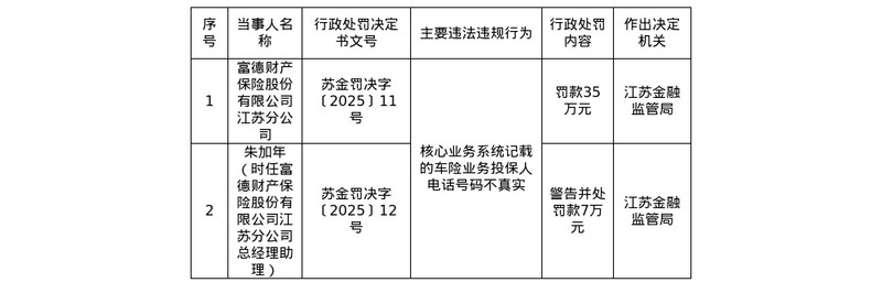 行政处罚决定书显示,富德财险江苏分公司的主要违法违规行为为:核心业务系统记载的车险业务投保人电话号码不真实。江苏金融监管局依据相关法规,对富德财险江苏分公司罚款35万元。