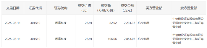 固高科技2月11日大宗交易成交188.98万股,成交额5085.44万元,占当日总成交额的7.17%,成交价26.91元,较市场收盘价30.58元折价12.0%。