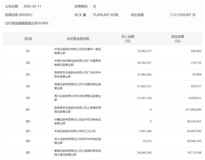 2月11日,拓维信息今日涨停,龙虎榜数据显示,上榜营业部席位全天成交7.47亿元,占当日总成交金额比例为49.43%。其中,买入金额为2.89亿元,卖出金额为4.58亿元,合计净卖出1.69亿元。
