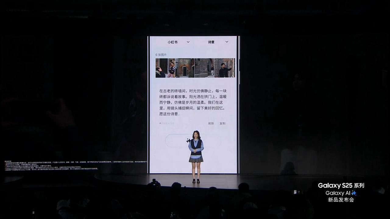 基于智谱Agentic GLM多模态能力,三星Galaxy S25系列手机支持社交媒体文案帮写功能,能够基于图片素材,自动生成包括小红书、微博和微信朋友圈在内的社交媒体文案内容。