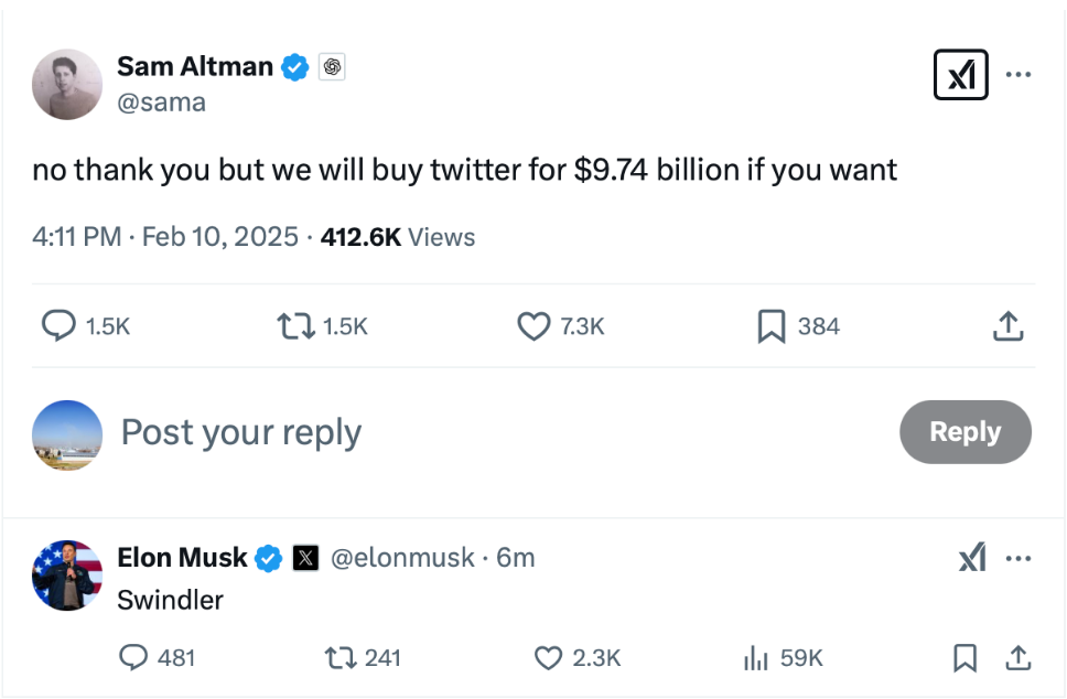 OpenAI首席执行官山姆·奥尔特曼在X平台上发帖称,他写道:“不了,谢谢。不过如果你愿意的话,我们可以花97.4亿美元收购推特。”
