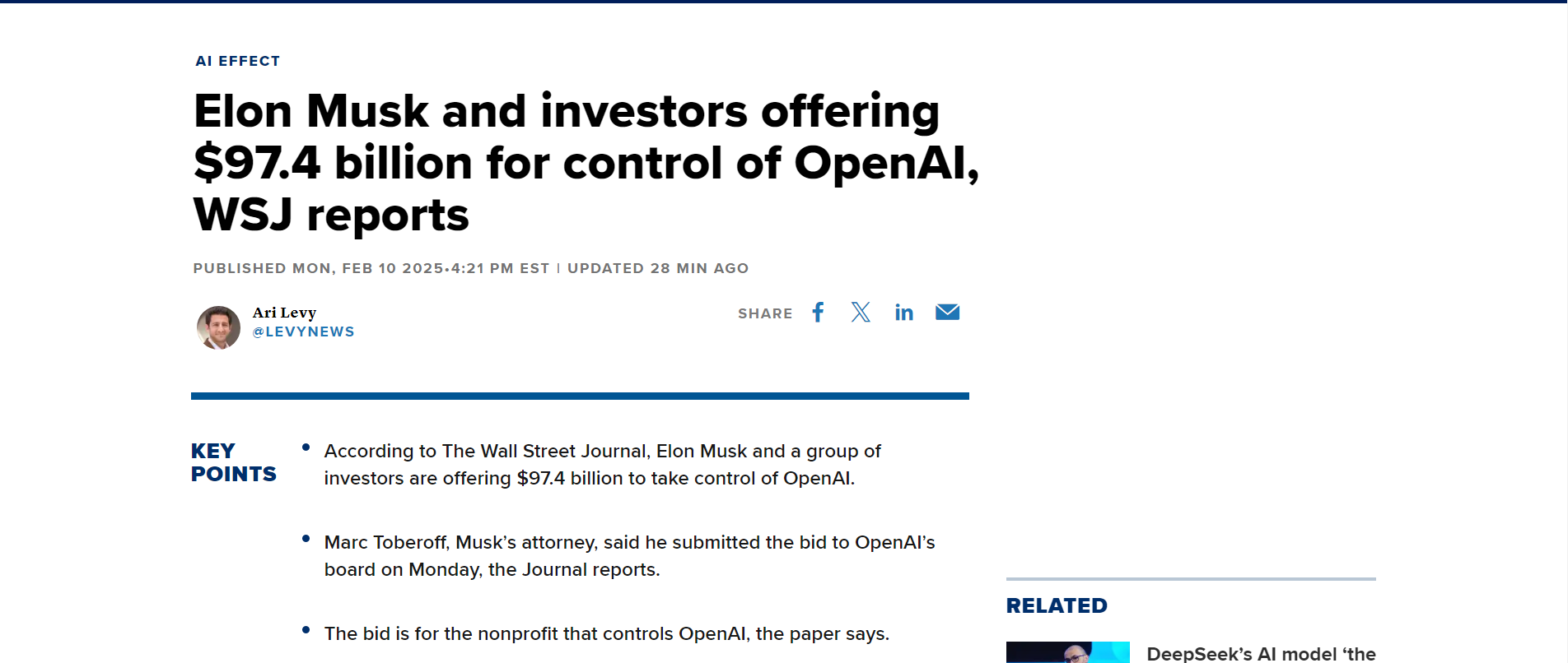 CCTV国际时讯消息,2月11日,美国企业家埃隆·马斯克等投资人当地时间2月10日提议“以974亿美元竞购”由其参与创建的美国开放人工智能研究中心(OpenAI)的非营利性母公司。