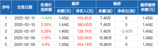 融资方面,当日融资买入616.06万元,融资偿还509.21万元,融资净买入106.85万元,连续5日净买入累计1400.58万元。融券方面,融券卖出0股,融券偿还0股,融券余量7.46万股,融券余额25.59万元。融资融券余额合计1.45亿元。