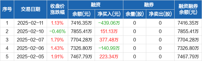 融资方面,当日融资买入492.07万元,融资偿还931.13万元,融资净偿还439.06万元。融券方面,融券卖出0股,融券偿还0股,融券余量0股,融券余额0元。融资融券余额合计7416.35万元。