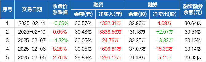融资方面,当日融资买入1.11亿元,融资偿还9765.13万元,融资净买入1332.31万元,连续5日净买入累计8098.57万元。融券方面,融券卖出4.49万股,融券偿还2.81万股,融券余量32.86万股,融券余额759.07万元。融资融券余额合计30.64亿元。