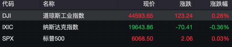 当地时间周二,美国股市三大股指收盘涨跌不一,其中道指涨0.28%,报44593.65点;标普500指数涨0.03%,报6068.5点;纳指跌0.36%,报19643.86点。