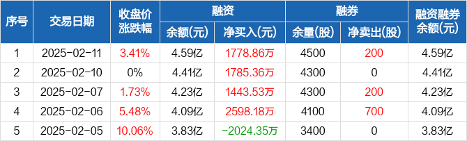 融资方面,当日融资买入9961.35万元,融资偿还8182.49万元,融资净买入1778.86万元,连续4日净买入累计7605.93万元。融券方面,融券卖出200股,融券偿还0股,融券余量4500股,融券余额1.91万元。融资融券余额合计4.59亿元。