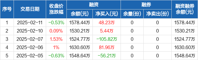 融资方面,当日融资买入83.46万元,融资偿还35.23万元,融资净买入48.23万元。融券方面,融券卖出0份,融券偿还0份,融券余量0份,融券余额0元。融资融券余额合计1578.44万元。
