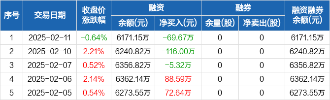 融资方面,当日融资买入145.16万元,融资偿还214.83万元,融资净偿还69.67万元,连续3日净偿还累计190.99万元。融券方面,融券卖出0股,融券偿还0股,融券余量0股,融券余额0元。融资融券余额合计6171.15万元。