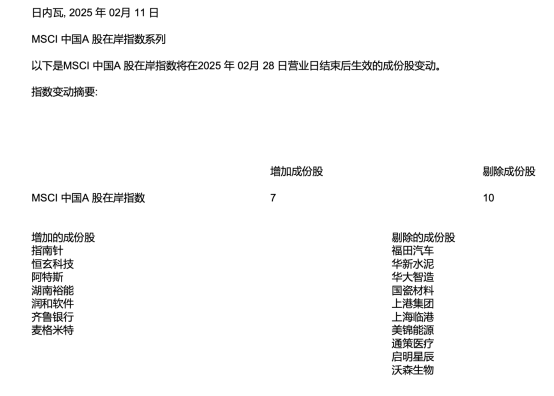 北京时间2月12日凌晨,国际指数编制公司MSCI公布了其2025年2月的指数季度调整结果,本次调整结果将于2025年2月28日收盘后生效。