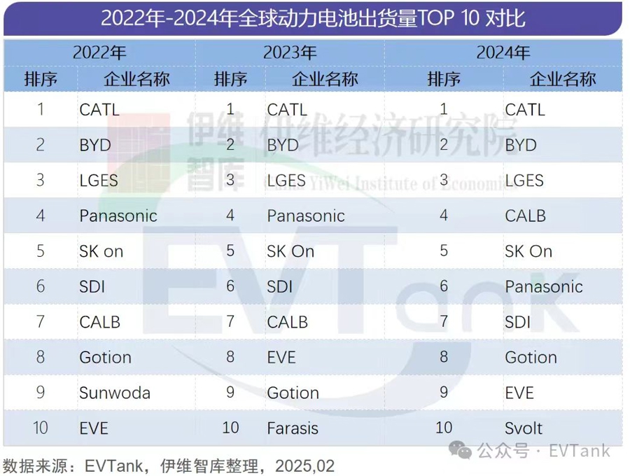 值得一提的是,2024年,中创新航取代日本松下排名全球第四,蜂巢能源首次进入全球动力电池出货量排名前十。