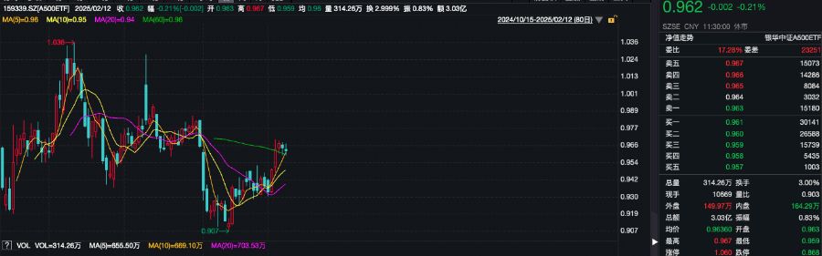 相关ETF方面,截至发稿,A500ETF(159339)截至午间收盘跌0.21%,成交额超3亿元,换手率3%,早盘交投活跃。Wind金融终端数据显示,截至2月11日,A500ETF(159339)最新流通规模101.63亿元,最新流通份额104.99亿份。