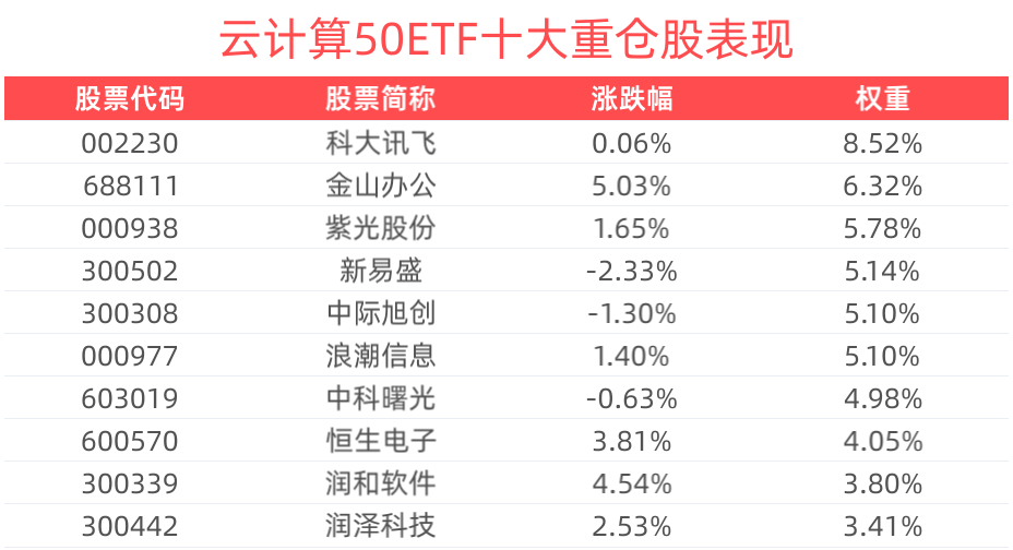 数据显示,截至2025年1月27日,中证云计算与大数据主题指数(930851)前十大权重股分别为科大讯飞(002230)、金山办公(688111)、新易盛(300502)、紫光股份(000938)、浪潮信息(000977)、中际旭创(300308)、中科曙光(603019)、润泽科技(300442)、恒生电子(600570)、润和软件(300339),前十大权重股合计占比53.4%。