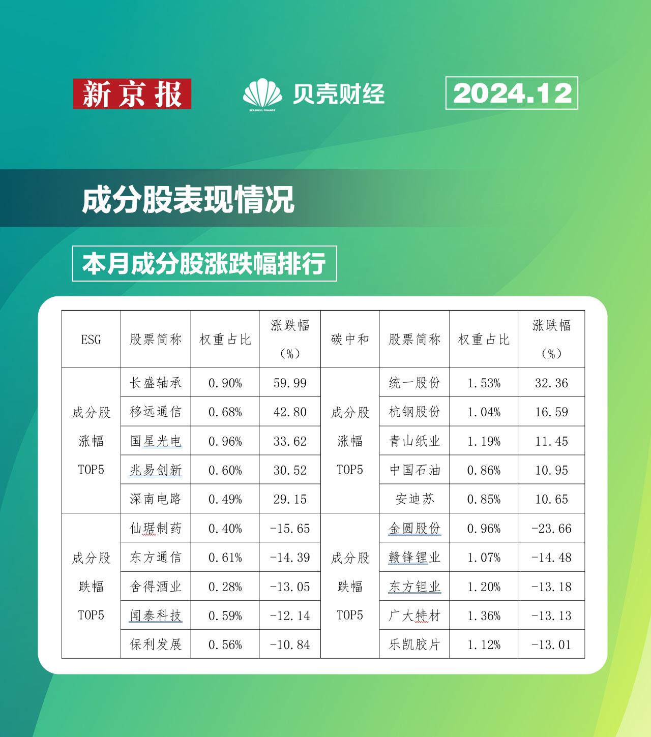 本次月报公布了美丽中国ESG指数和碳中和100指数的成分股表现情况。