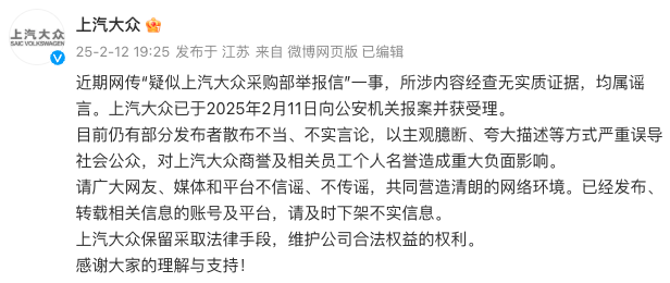 2月12日,@上汽大众发文回应“疑似上汽大众采购部举报信”事件。
