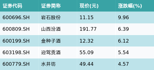 截至午间收盘,白酒概念主题涨跌幅最高的五只股票为:岩石股份(600696.SH)、山西汾酒(600809.SH)、金种子酒(600199.SH)、迎驾贡酒(603198.SH)与水井坊(600779.SH)。详情见下表: