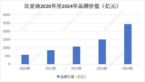 每经品牌价值研究院以每日经济新闻和清华大学经济管理学院中国企业研究中心联合发布的“中国上市公司品牌价值榜”为数据基础,统计了比亚迪2020年至2024年的品牌价值。资料显示,公司品牌价值增长较快,甚至增速还在不断上升。
