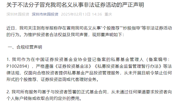 【大河财立方消息】2月13日,深圳市林园投资管理有限责任公司(以下简称:林园投资)发布声明称,关注到有举报称存在冒用公司名义从事“个股推荐”“炒股指导”等非法证券活动的行为。
