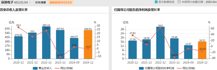 环旭电子(601231.SH)业绩继续下滑。业绩快报显示,公司2024年实现营业收入606.91亿元,同比下降0.17%;归母净利润16.52亿元,同比减少15.16%。公司预计2025年第一季单季营业收入同比减少5%以内,营业利润率同比下滑0.5-0.7个百分点。