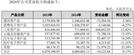 “云端及存储类产品营业收入同比增长主要受益于行业需求恢复及新技术应用的发展;汽车电子类产品营业收入同比增长主要受益于合并赫思曼汽车通讯公司的报表;工业类产品受下游需求影响,同比出现下滑。”环旭电子解释称。